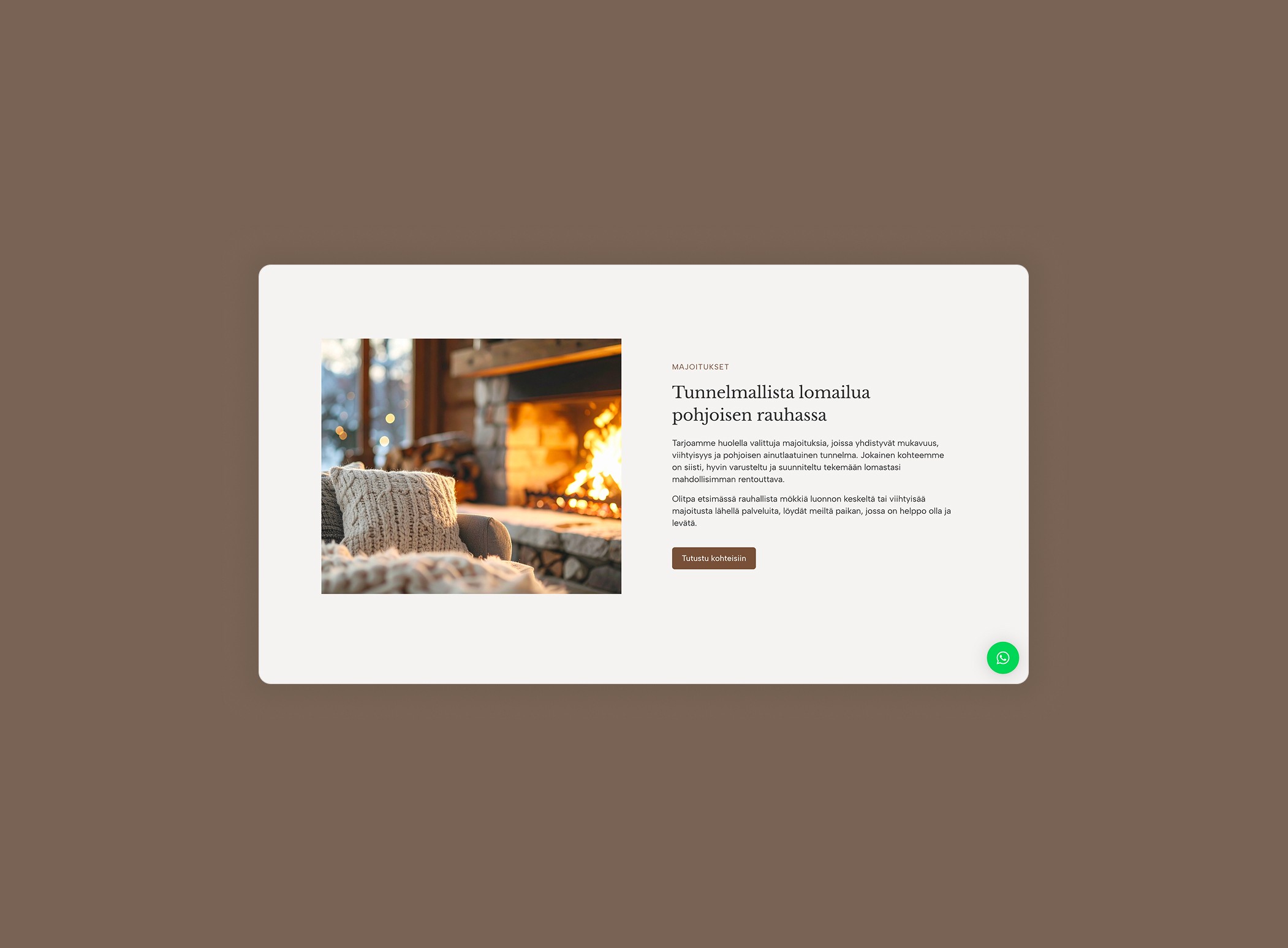 Suunnittelimme WordPress-alustalle rakennetun sivuston, jossa yhdistyvät selkeä palvelukuvaus, vahva myynnillinen rakenne ja tunnelmallinen visuaalinen ilme. Sivuston tavoitteena on tehdä palvelun hyödyt helposti ymmärrettäviksi ja ohjata kävijä yhteydenottoon.