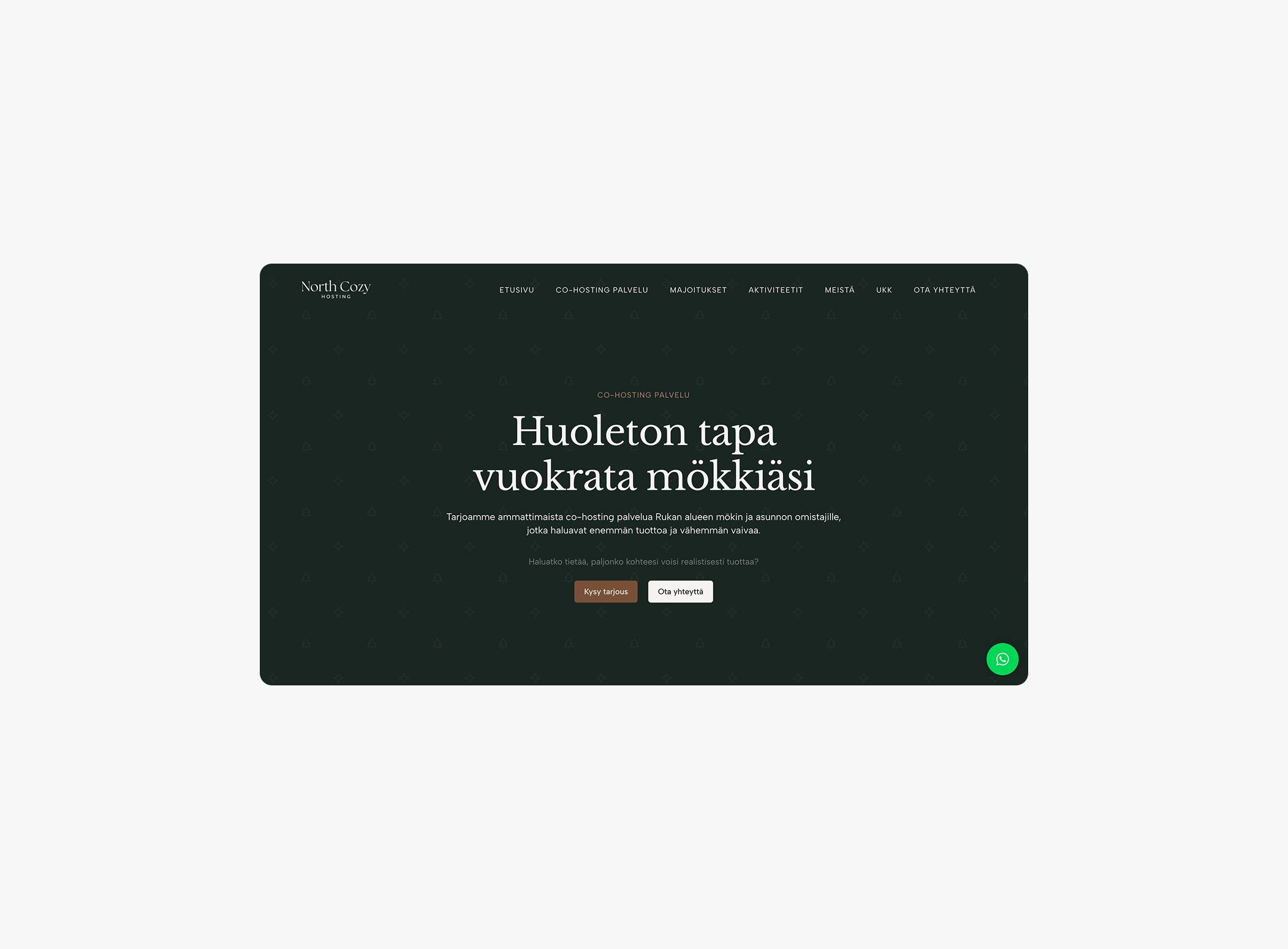 North Cozy tarjoaa co-hosting-palvelua mökinomistajille ja asuntosijoittajille Rukan alueella, ja tarvitsi verkkosivut, jotka viestivät luotettavuutta, laatua ja vaivatonta vuokraamista.